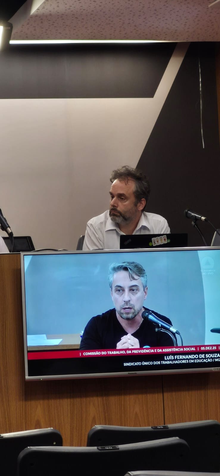 Os coordenadores do Sitraemg David Landau e Joana D’Arc Guimarães participaram no dia 5 de dezembro, sexta-feira, da Audiência Pública sobre a Reforma Administrativa, realizada pela Comissão do Trabalho, da Previdência e da Assistência Social da Assembleia Legislativa de Minas Gerais, convocada pelo deputado Betão (PT). Os dirigentes estiveram acompanhados do assessor econômico do Sitraemg, Jean Peres.